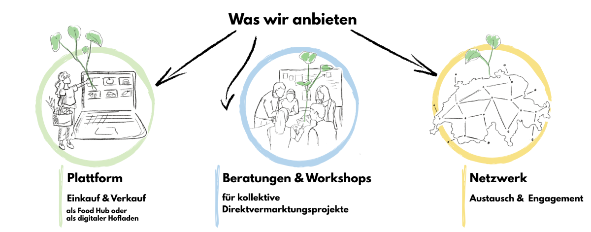 Wir von Open Food Network Schweiz bieten euch kostenlose Unterstützung an bei den ersten Schritten auf der Plattform. Ausserdem gibt es auch die Möglichkeit an unseren kostenlosen wöchentlichen Webinaren teilzunehmen, wo wir Interessent:innen mehr über Open Food Network und unsere Plattform erzählen. Unabhängig von der Plattform, unterstützen wir Gruppen bei der Planung, Weiterentwicklung und Umsetzung gemeinschaftlicher Direktvermarktung. In praxisnahen Workshops, Webinaren und individuellen Beratungen vermitteln wir Wissen zur OFN Plattform, Community Building, Projektfinanzierung, Vereins– oder Genossenschaftsgründung, Produktbeschaffung und Logistik. So begleiten wir euch von der ersten Idee bis zur Umsetzung.