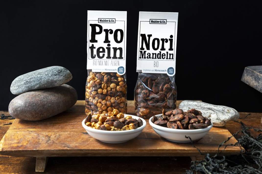 Die stetig wachsende Produktepalette wurde kürzlich durch zwei neue Nusskreationen ergänzt: Mit den Nori Mandeln Bio und dem Protein Bio-Mix mit Algen von Mahler & Co., die beide von Hirncoach empfohlen werden, lassen sich Gesundheit und Genuss verbinden, zwischendurch oder beim Apéro.